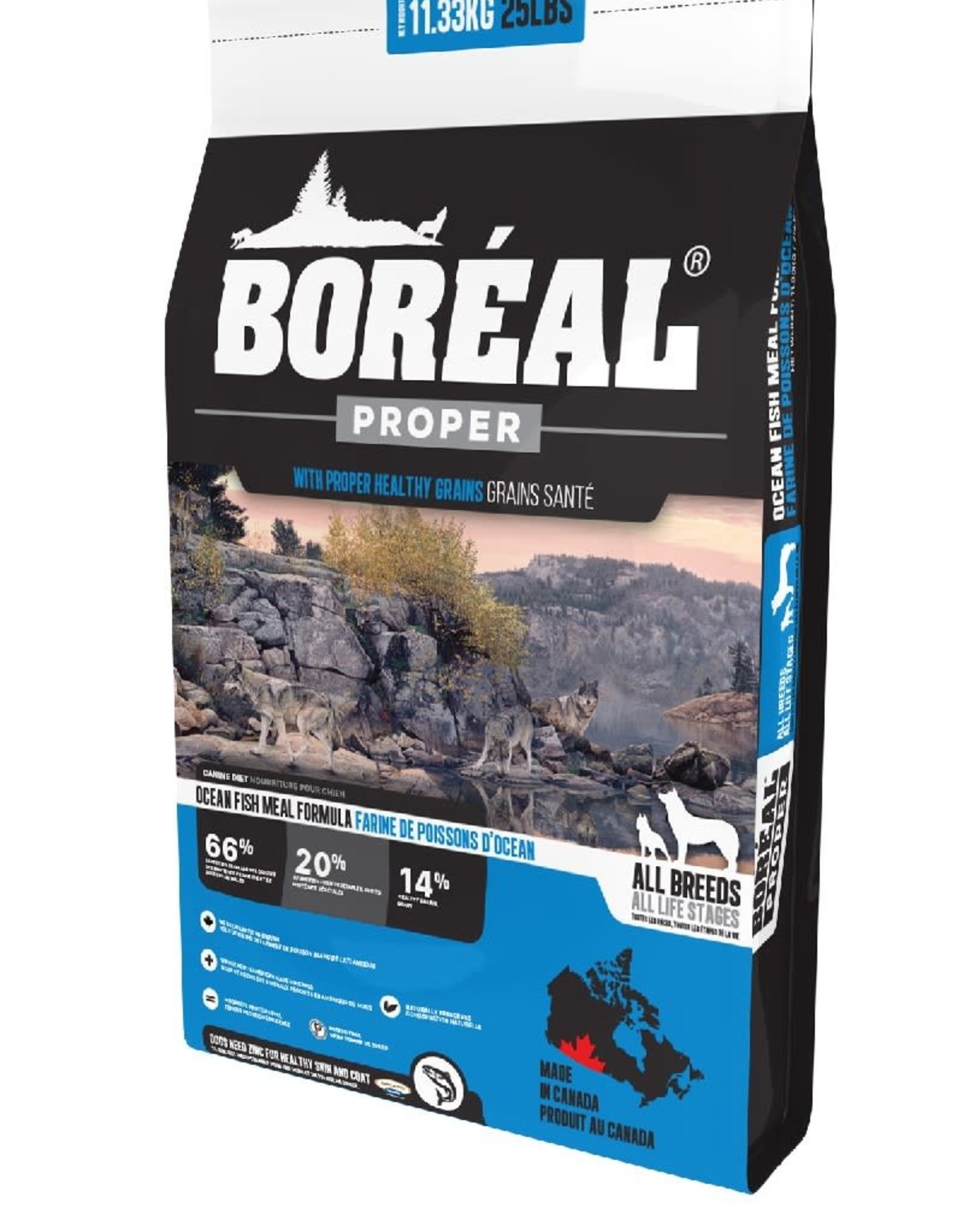 Proper Ocean Fish Meal is an All Breed diet based on fish meals with a low glycemic base of pea and beans. We believe that pet foods should avoid starchy ingredients that might lead to weight gain and obesity. An alternative to a grain free diet is to pick a dog food that avoids the high sugar grains such as corn or wheat. There are particular grains such as steel cut oats that are very good for your dog and have many beneficial properties. That’s why we at Boréal have developed a line called Boréal Proper Dog Food.